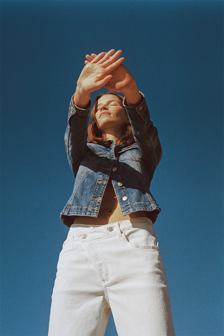 To be even more glamorous, replace the denim trousers with a slit denim skirt and heels for a real femme fatale look! And above all, don't forget to mismatch the shades of denim blue.