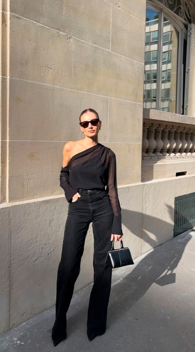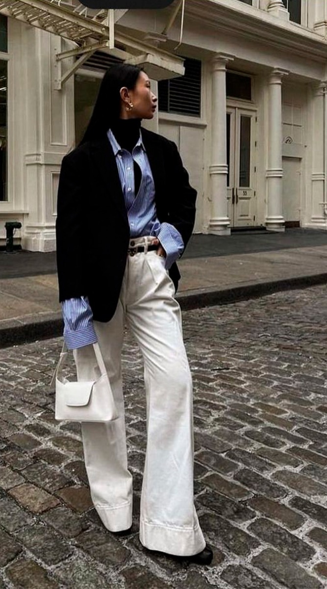 Choose a fitted silk shirt, raw slim jeans, and an elegant black blazer. Don’t forget a belt to highlight your waist and a pair of pumps. Complete the outfit with a long black coat, a handbag, and some discreet jewelry.