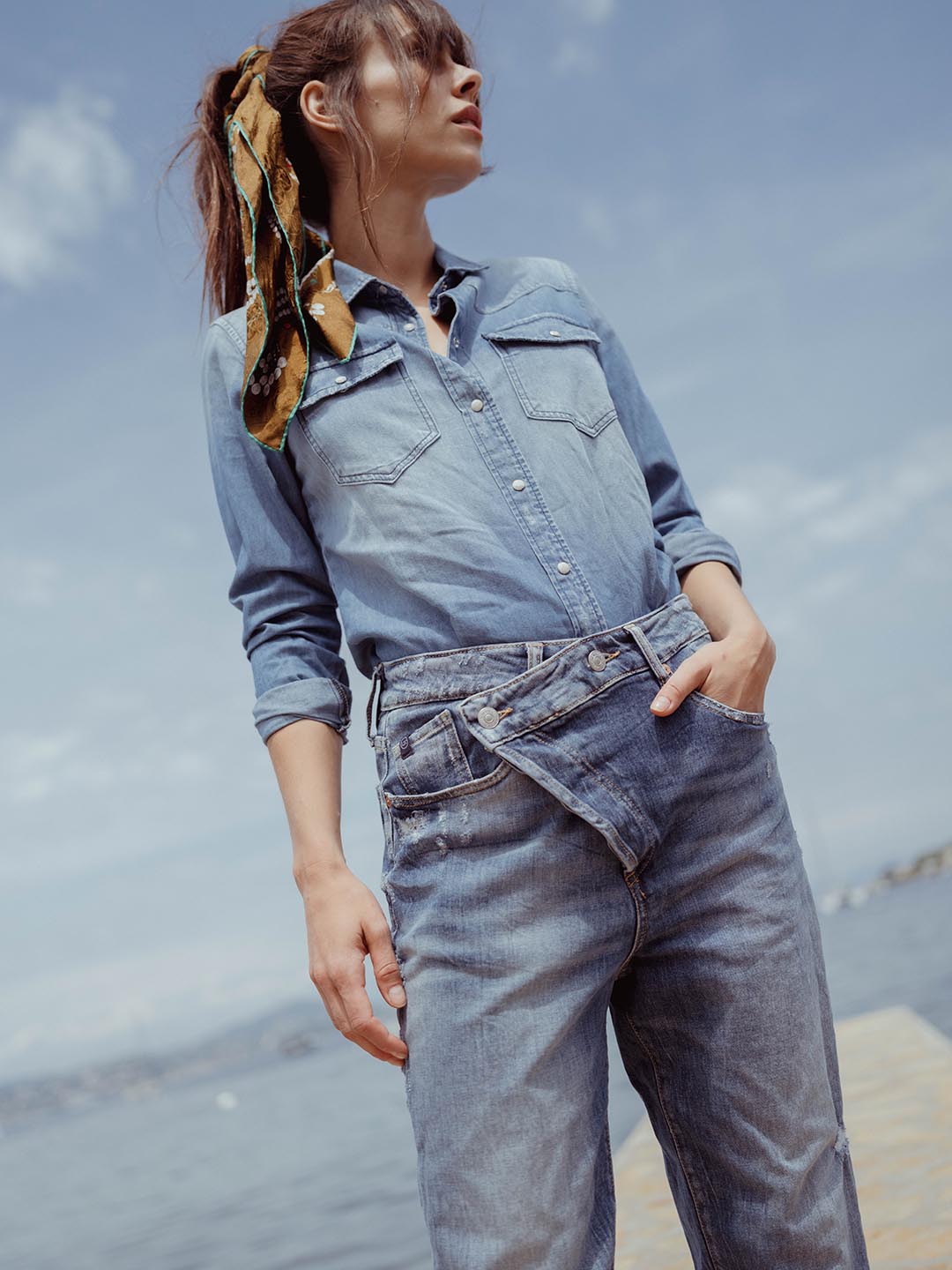 Denim pieces with asymmetrical buttons and closures