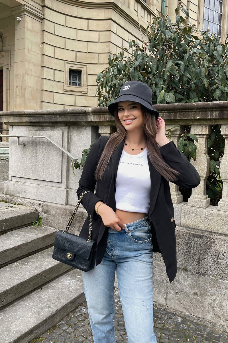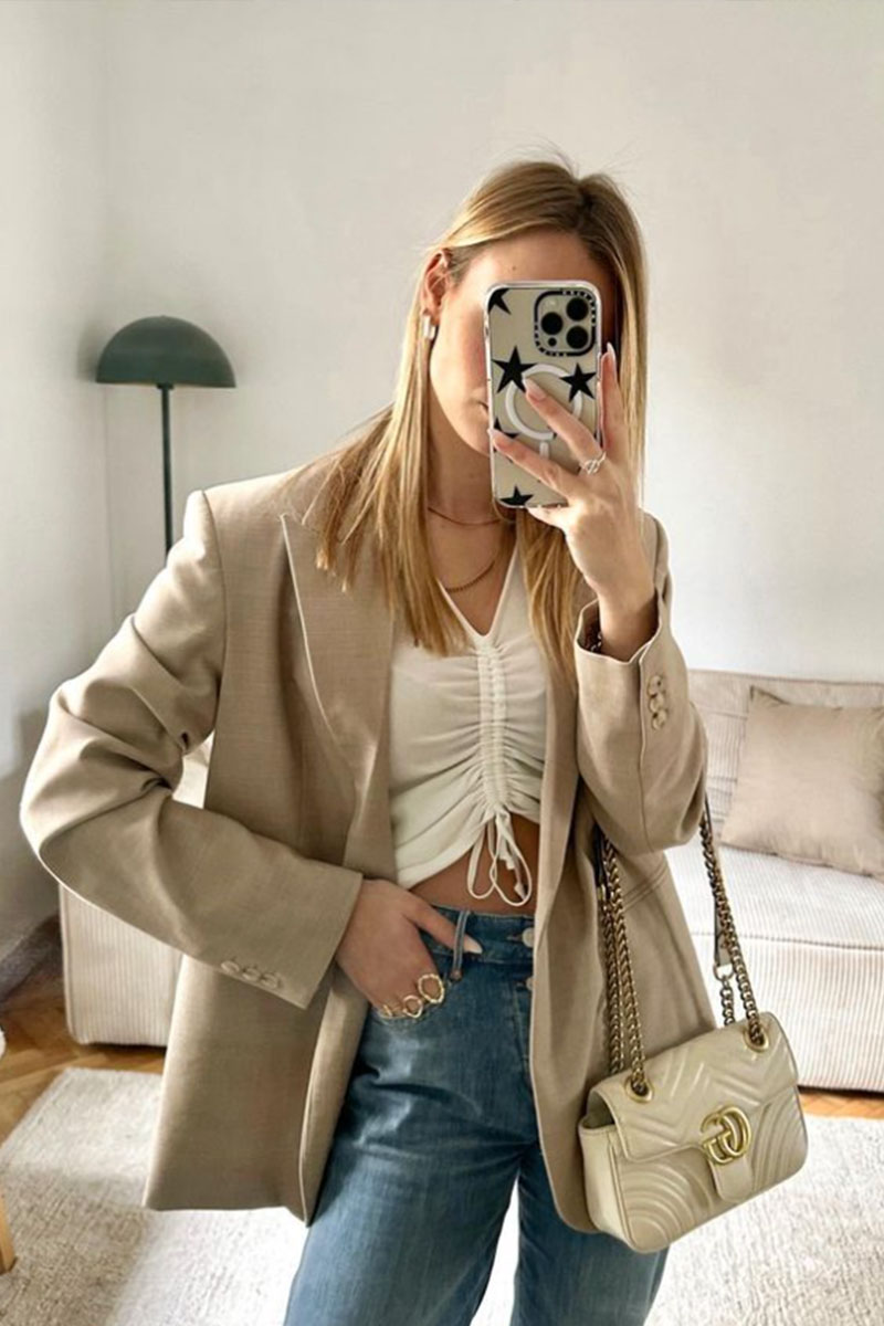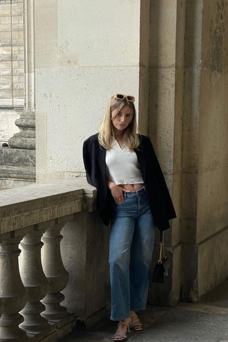 Pick out a crop top that subtly showcases your navel and a pair of regular high-waist jeans for their casual side. This will go well with a pair of trendy sneakers. We can round off the outfit with a tracksuit top, a blazer or a bomber jacket when the weather is cooler.