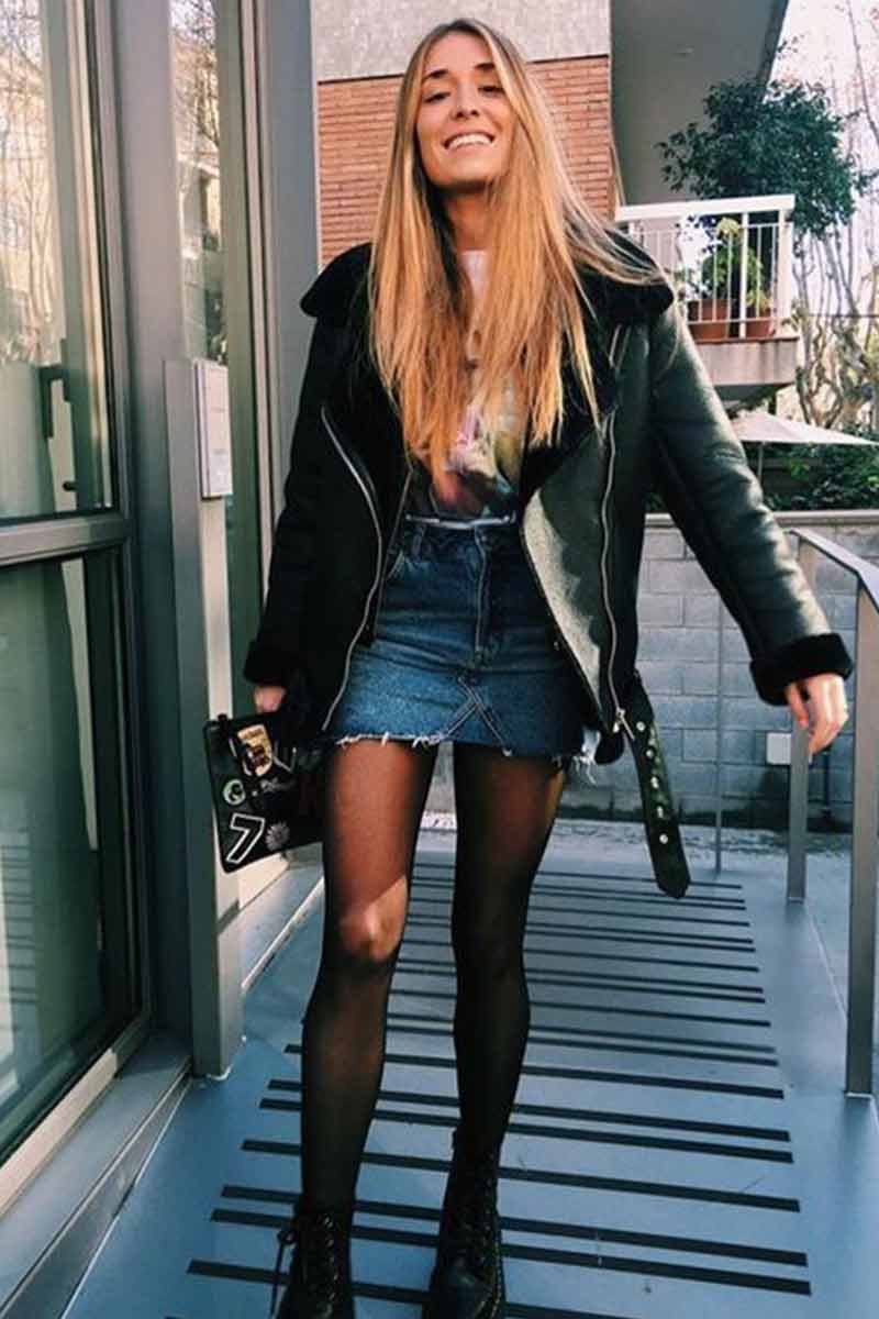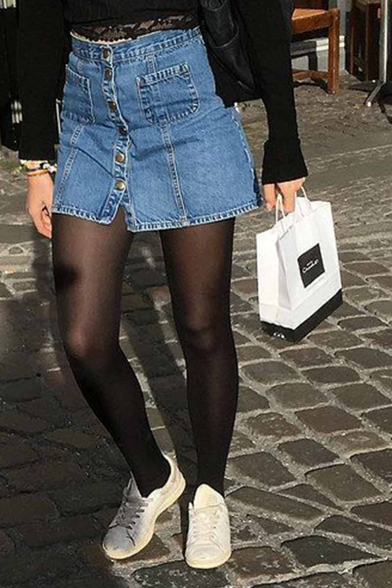 Fishnet tights are the sexy accessory that with a denim skirt will reveal your femme fatale edge! With boots or ankle boots, you'll be sure to stand out! Of course, choose them in black to stay classy. The black denim skirt is best paired with these very elegant tights. The high-waisted denim skirt is also very glamorous with heeled boots. For a more grungy and rebellious look, the combination of blue denim skirt and fishnet tights is perfect!