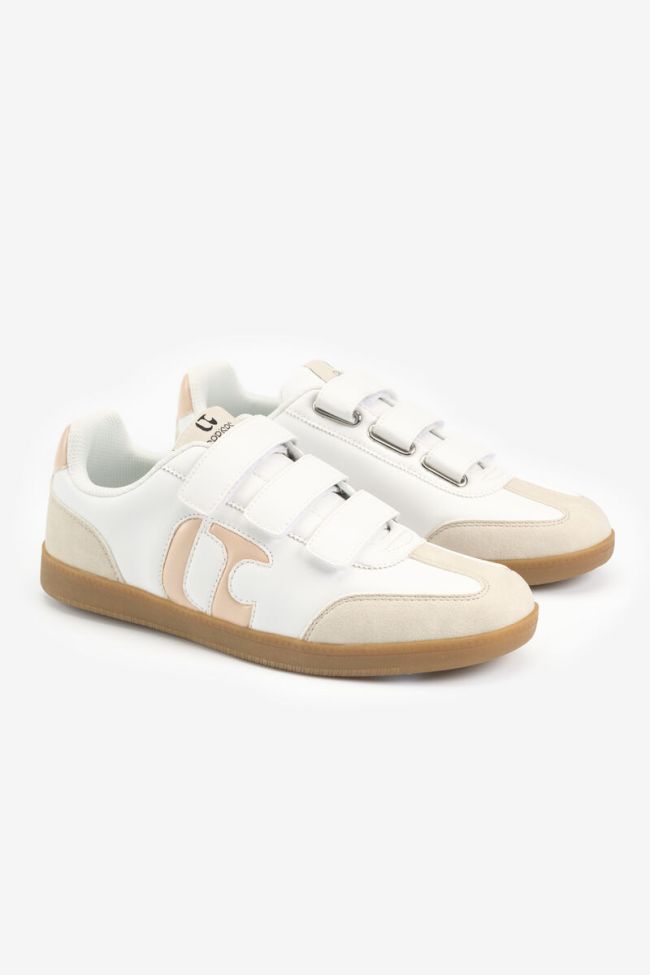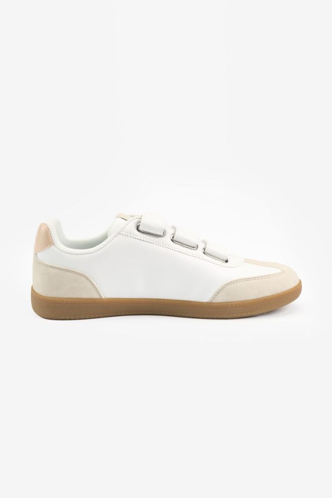 Scratch and white sneakers with beige monogram.