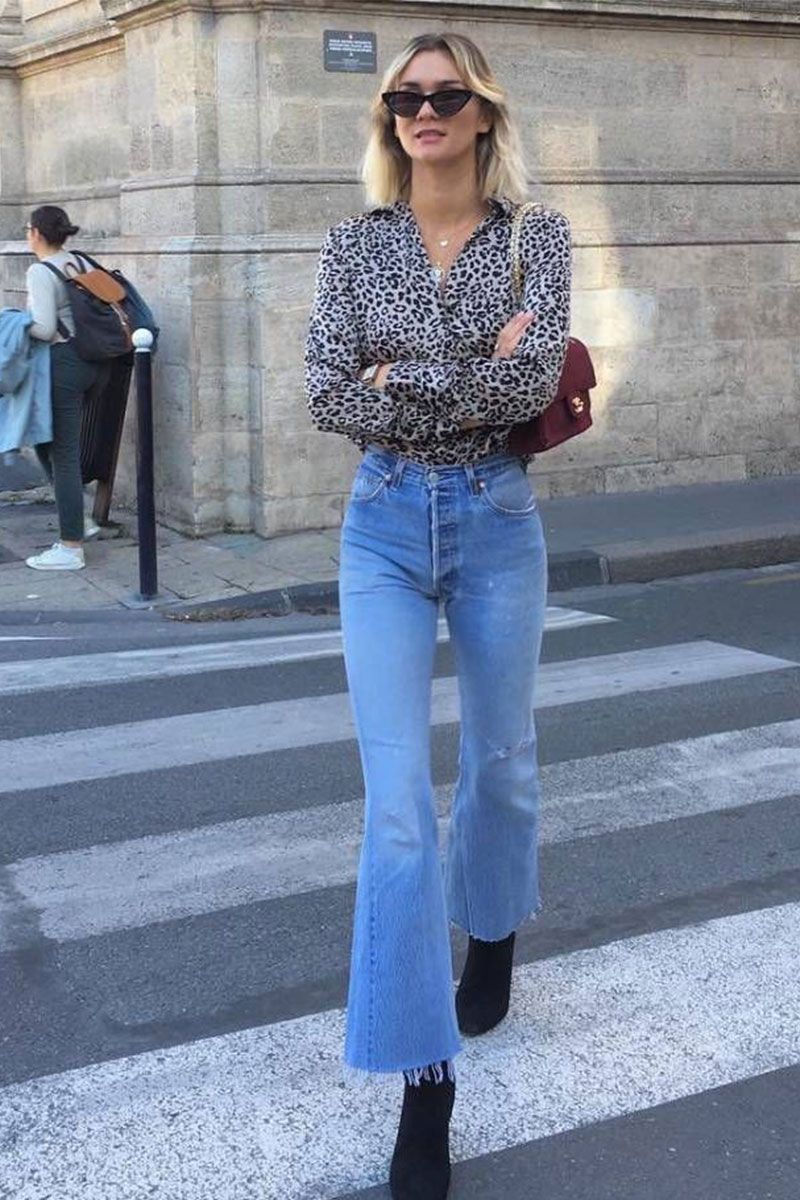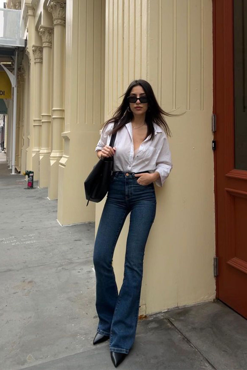 Pour un look chic ultra glamour, on opte pour des chaussures à talons avec son jean bootcut taille haute. On accessoirise à l’aide d’une ceinture pour souligner sa taille et on met une jolie chemise blanche fluide. Bien entendu, on porte ses plus jolis bijoux, son sac à main préféré et on applique un rouge à lèvres sexy.