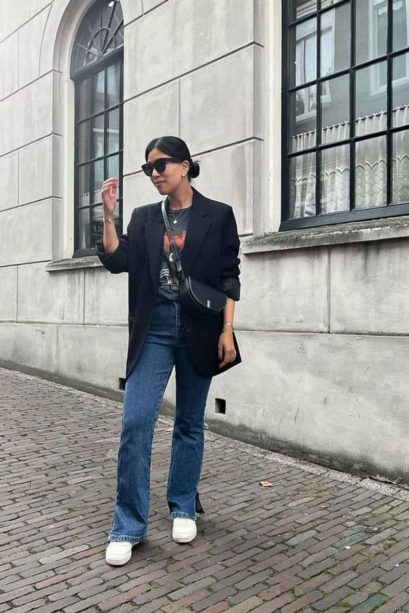 On enfile une paire de basket tendance et un crop top à manches courtes pour un style casual tendance avec son jean bootcut. On termine par un joli blazer coloré.