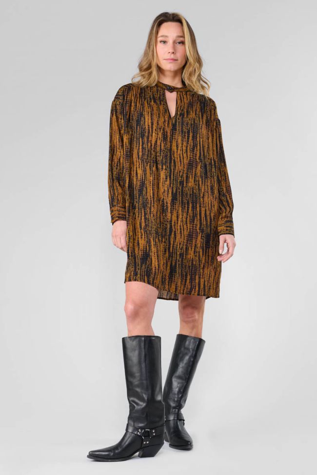 This Roy dress is your fashion ally, with its tie and dye pattern, babydoll shape and shiny gold threads. For a variety of styles, the collar can be worn open or closed with a button. For added comfort, a thin removable belt completes the piece.
