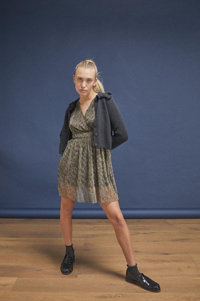 A feminine, festive Brookygi dress made from pleated fabric combining gold and black, with an elasticated waist for a fitted look and a wrapover collar with press-stud. The dress is lined for added comfort.