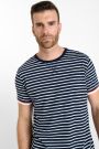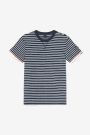 Navy blue striped T-shirt with short sleeves and contrasting hems on the sleeves.