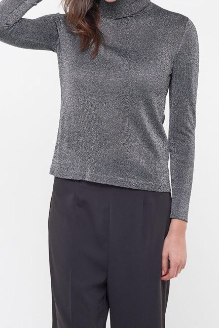 A woman's pullover that will give you an elegant, sexy look with holes in the shoulders, a high and openwork collar, a shiny border, lace, …