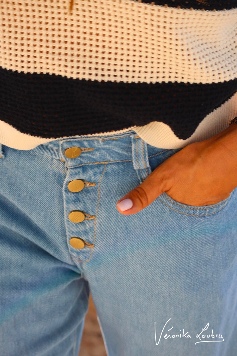 Black, blue, white, khaki, tie and dye, the best of jeans available in your favorite colors with the brand's iconic details: asymmetric closure, destroy, iconic stitching, patch pockets. Choose the cut of your Véronika Loubry jeans and opt for a silhouette highlighted with the flare jeans by Véronika Loubry, a trendy look with the jumpsuits by Véronika Loubry, a casual look with the boyfit jeans by Véronika Loubry, a feminine look with straight or casual jeans with the regular pulp jeans by Véronika Loubry.